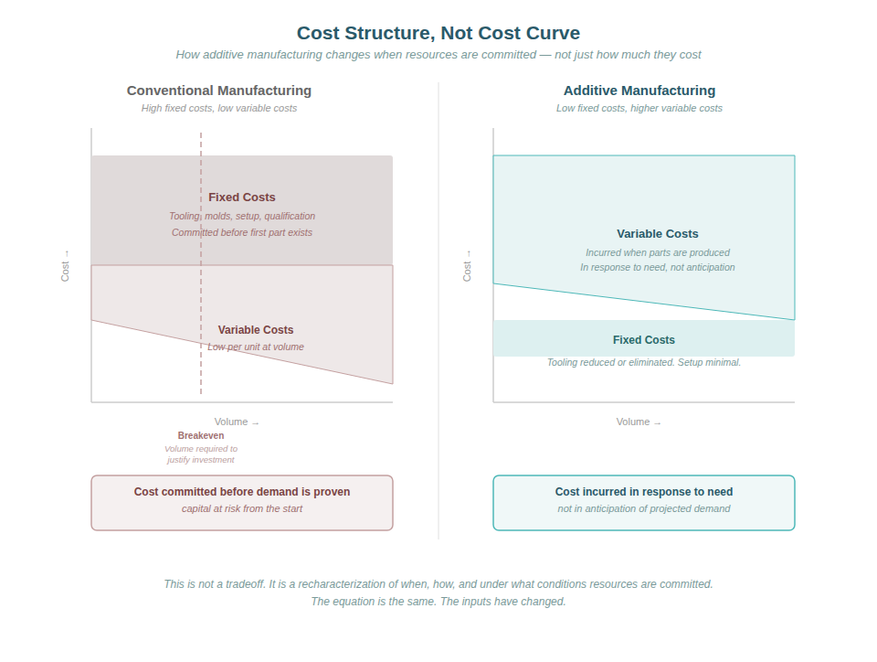 Additive manufacturing lowers those thresholds structurally. It does not eliminate tradeoffs, but it weakens the link between associated penalties and acting without scale.