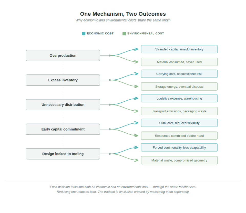 Five manufacturing decisions, each forking into an economic and an environmental cost—through the same mechanism.